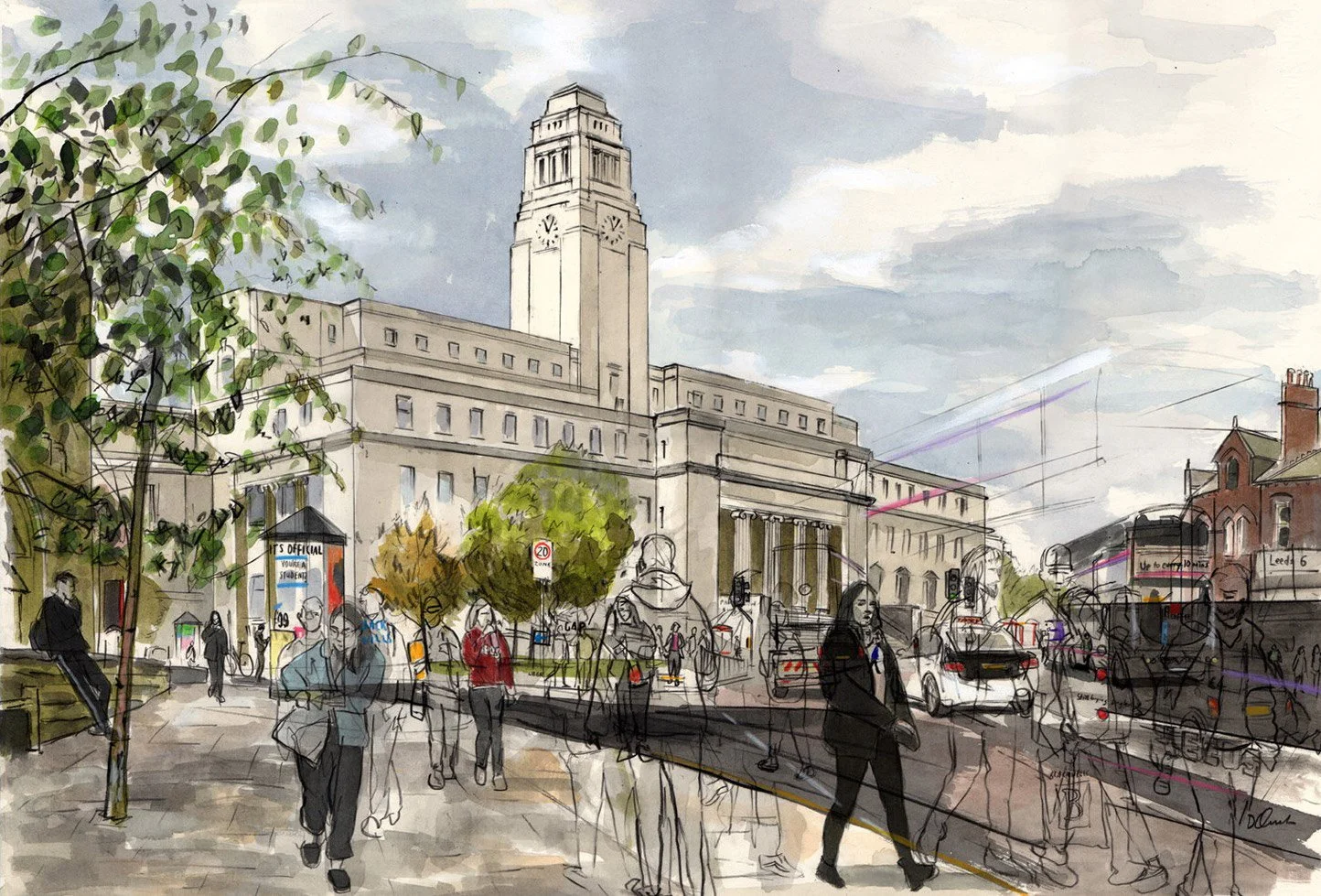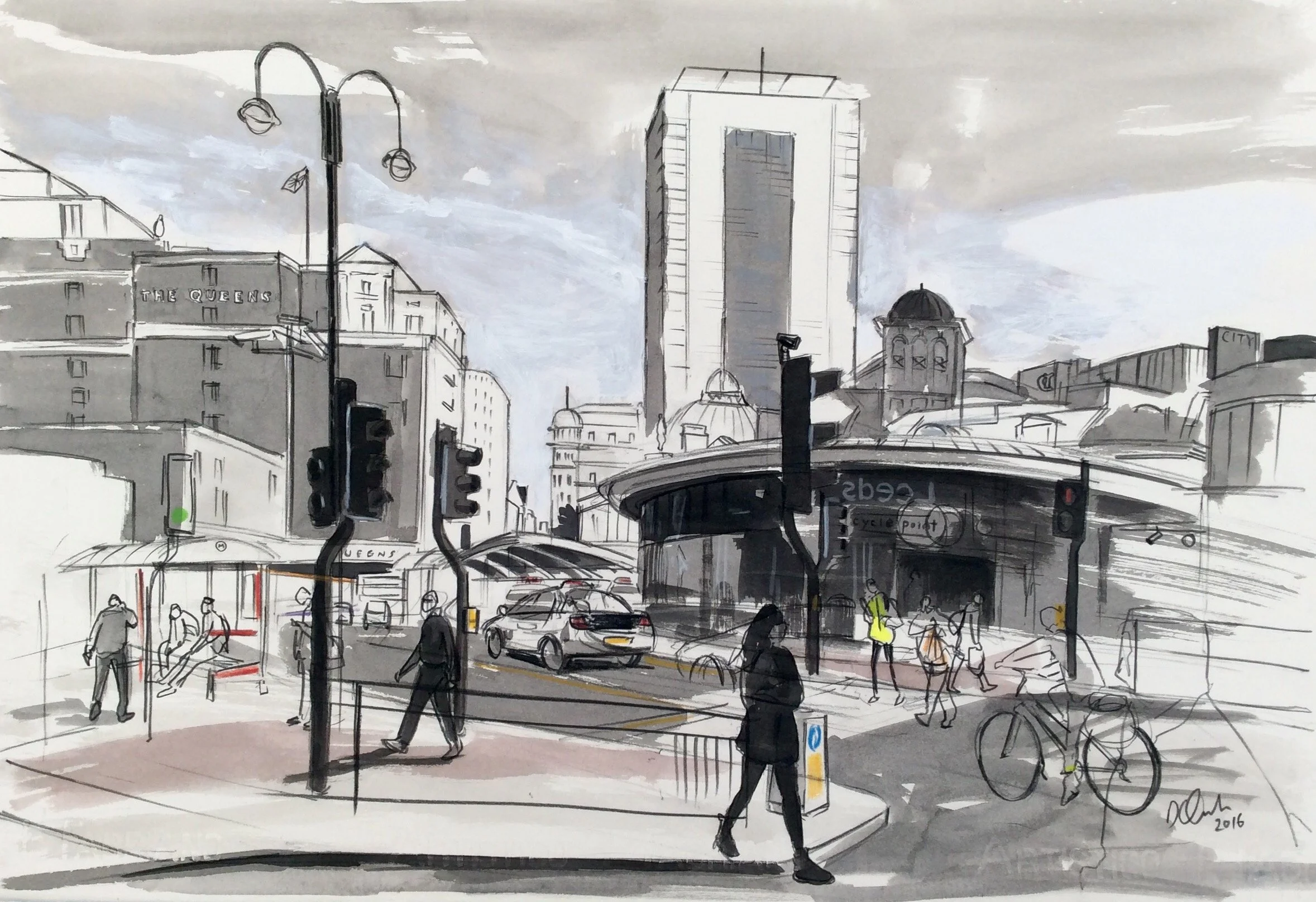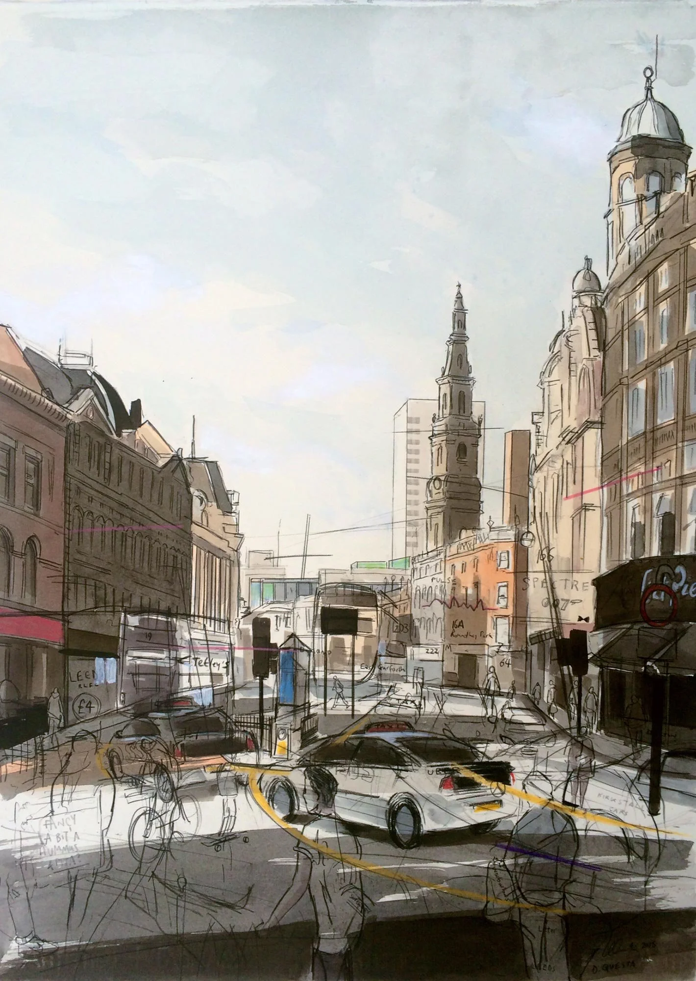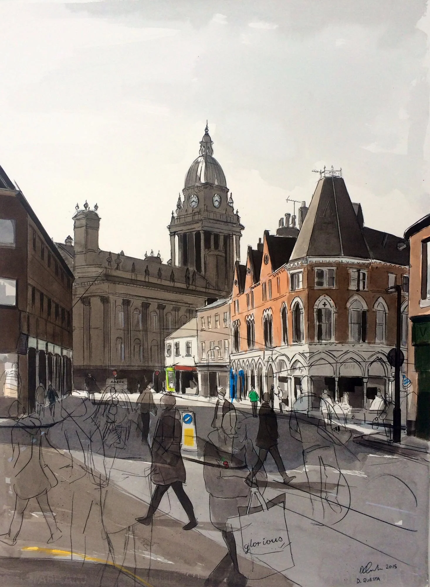Observed from either street-level or from a more elevated perspective, David’s drawings and paintings combine the familiar solid structures which make up our urban landscape with the busy people who live and work in and amongst them. They show us a record of a city that like all cities is constantly evolving.