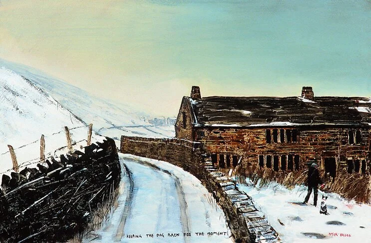 Peter Brook was born in the winter of 1927 in the Pennine village of Scholes near the 'summer wine' county of Holmfirth. His parents were farmers initially and Peter grew up among milk carts, helping with the haymaking and drinking ginger beer made by his grandmother. Both winter and the Pennines would continue to play a large part in this Yorkshire painter’s life. Peter was educated at Barnsley Grammar School before moving on to teacher training at Goldsmiths College, part of London University, where he visited exhibitions and galleries whilst also attending evening classes in life drawing. After two years in the RAF, Peter returned to Yorkshire where he became a teacher in Rastrick, near Brighouse, West Yorkshire. There he married Molly. In Brighouse, he found everything he needed to test his skills and start his life in art: its factories, stone built houses, colours, shapes and people. Initially he used thick paints, but this didn't give him the effect he wanted. This came when he began to mix very fine sandstone from a nearby quarry into the paint for the buildings, which gave them more substance and more power and was contrasted with his smooth sky lines which might be made using rags, rollers or his fingers.