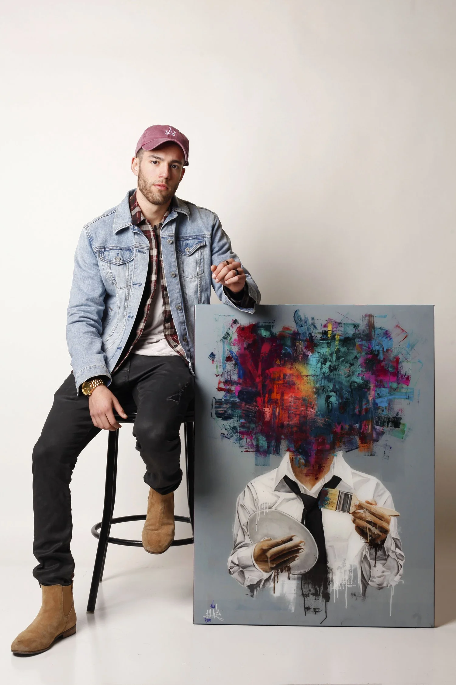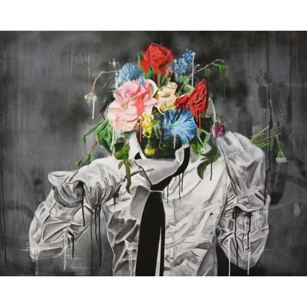Sage Barnes’ work is characterised by his urban street-art inspired portraits, where the figure's head is usually missing and replaced with a burst of colour. Common motifs within his work include smiley faces, balloons, flowers, splattered paint, or colourful pixels.Sage works primarily with acrylic and spray paint on canvas and experiments with different mixed media elements such as artificial flowers, stucco and foam.